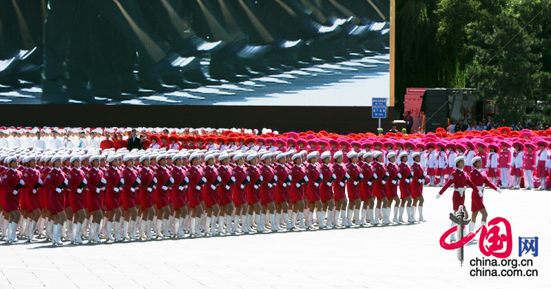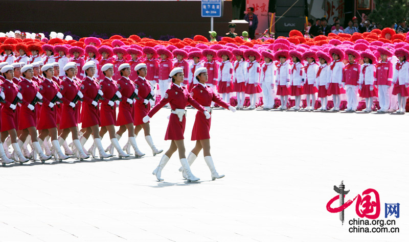 10月1日,首都各界慶祝中華人民共和國成立60周年大會在北京舉行。這是女民兵方隊通過天安門廣場。中國網/胡迪攝